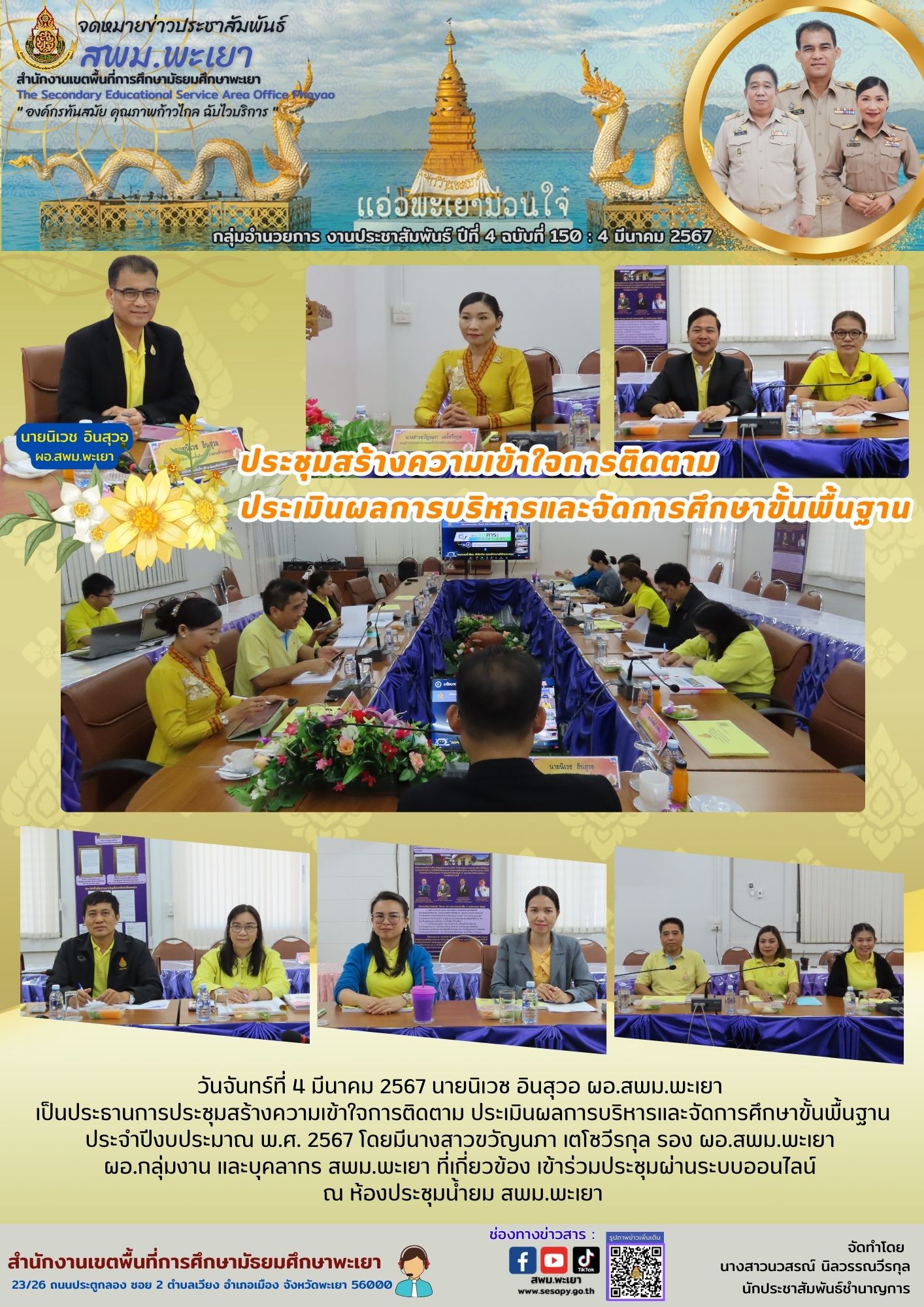 เป็นประธานการประชุมสร้างความเข้าใจการติดตาม ประเมินผลการบริหารและจัดการศึกษาขั้นพื้นฐาน ประจำปีงบประมาณ พ.ศ. 2567 โดยมีนางสาวขวัญนภา เตโชวีรกุล รอง ผอ.สพม.พะเยา