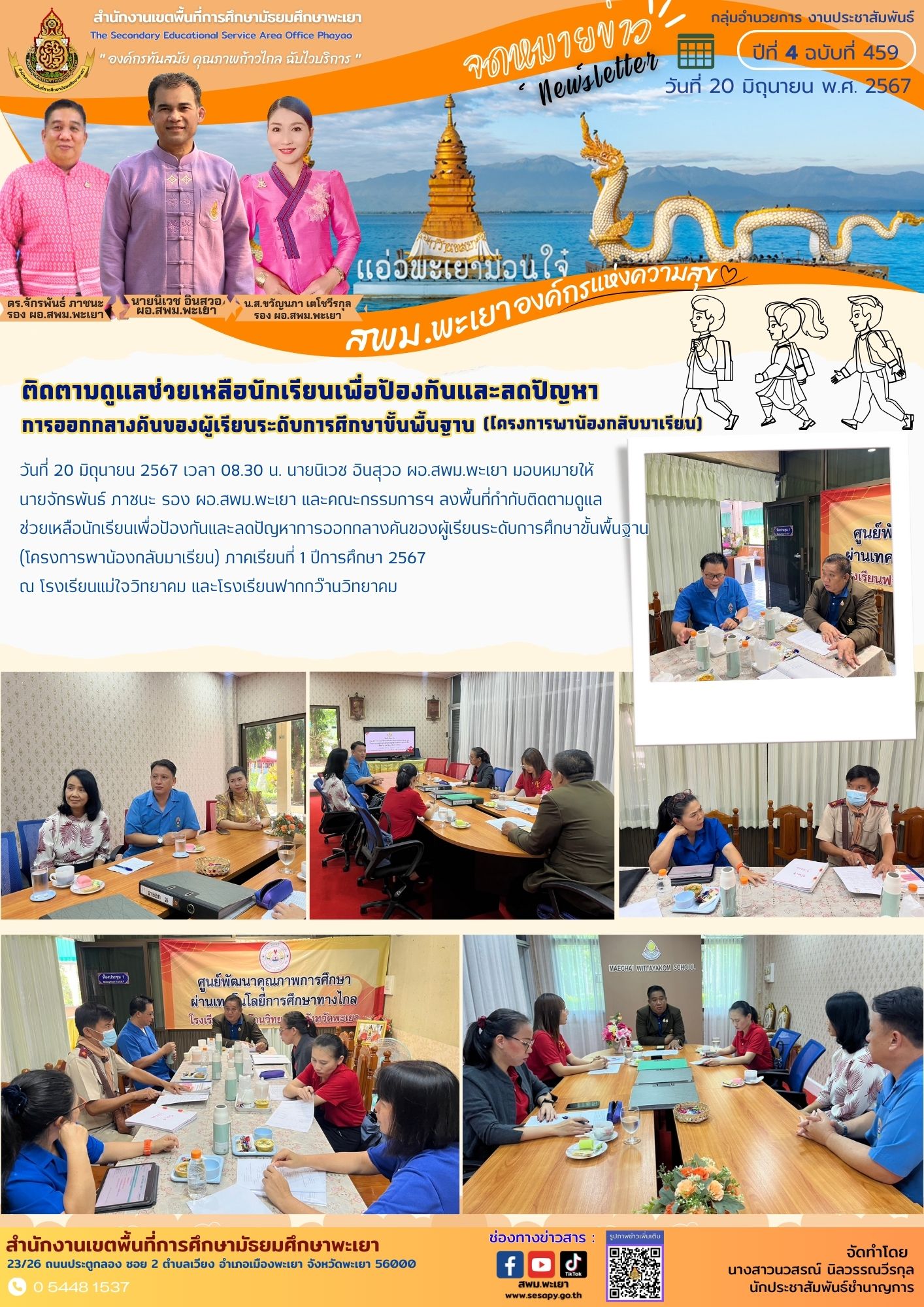 วันที่ 20 มิถุนายน 2567 เวลา 08.30 น. นายนิเวช อินสุวอ ผอ.สพม.พะเยา มอบหมายให้
