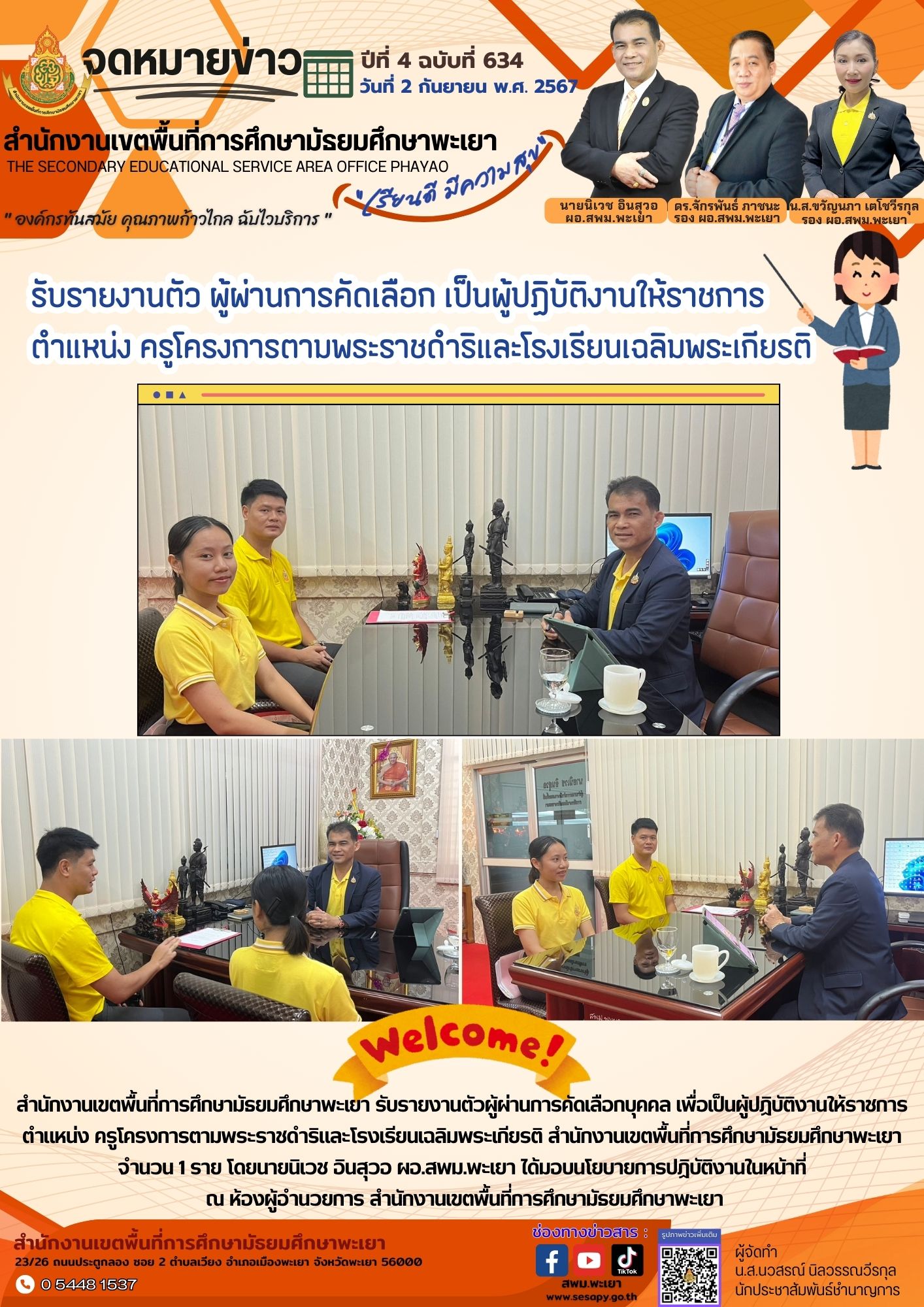 สำนักงานเขตพื้นที่การศึกษามัธยมศึกษาพะเยา รับรายงานตัวผู้ผ่านการคัดเลือกบุคคล เพื่อเป็นผู้ปฏิบัติงานให้ราชการ