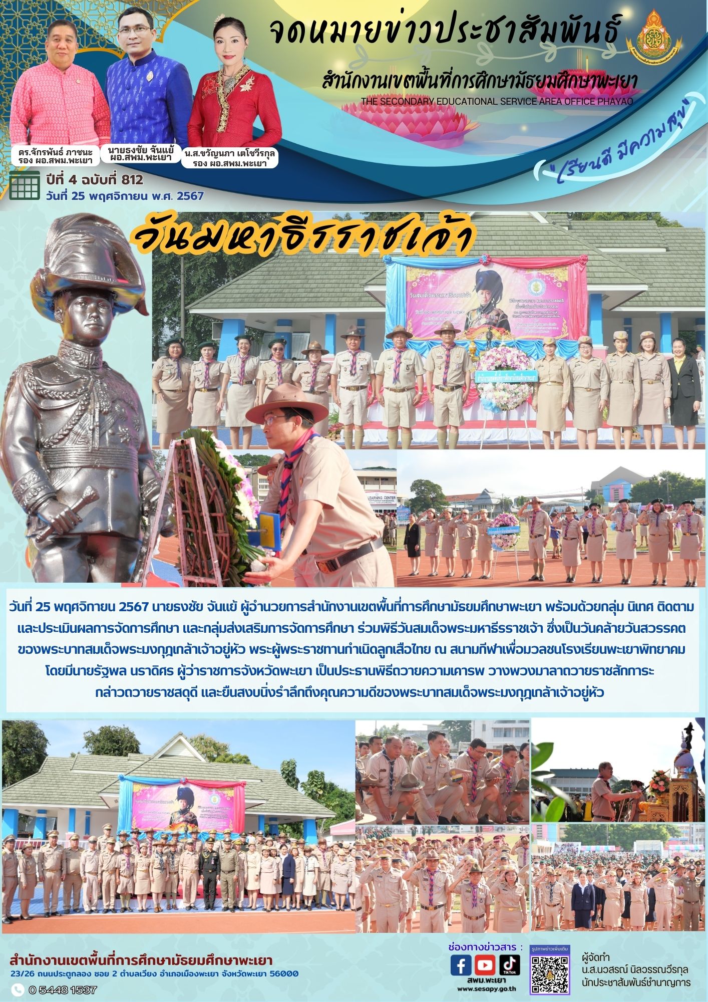 วันที่ 25 พฤศจิกายน 2567 นายธงชัย จันแย้ ผู้อำนวยการสำนักงานเขตพื้นที่การศึกษามัธยมศึกษาพะเยา