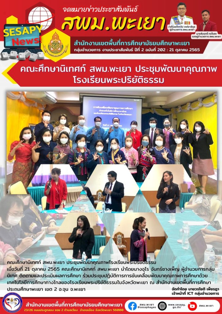 เมื่อวันที่ 21 ตุลาคม 2565 คณะศึกษานิเทศก์ สพม.พะเยา นำโดยนางอุไร จันทร์ซางเพ็ญ ผู้อำนวยการกลุ่มนิเทศ ติดตามและประเมินผลการศึกษา ร่วมประชุมปฏิบัติการการขับเคลื่อนพัฒนาคุณภาพการศึกษาด้วยเทคโนโลยีการศึกษาทางไกลของโรงเรียนพระปริยัติธรรมในจังหวัดพะเยา ณ สำนักงานเขตพื้นที่การศึกษาประถมศึกษาพะเยา เขต 2 อ.จุน จ.พะเยา