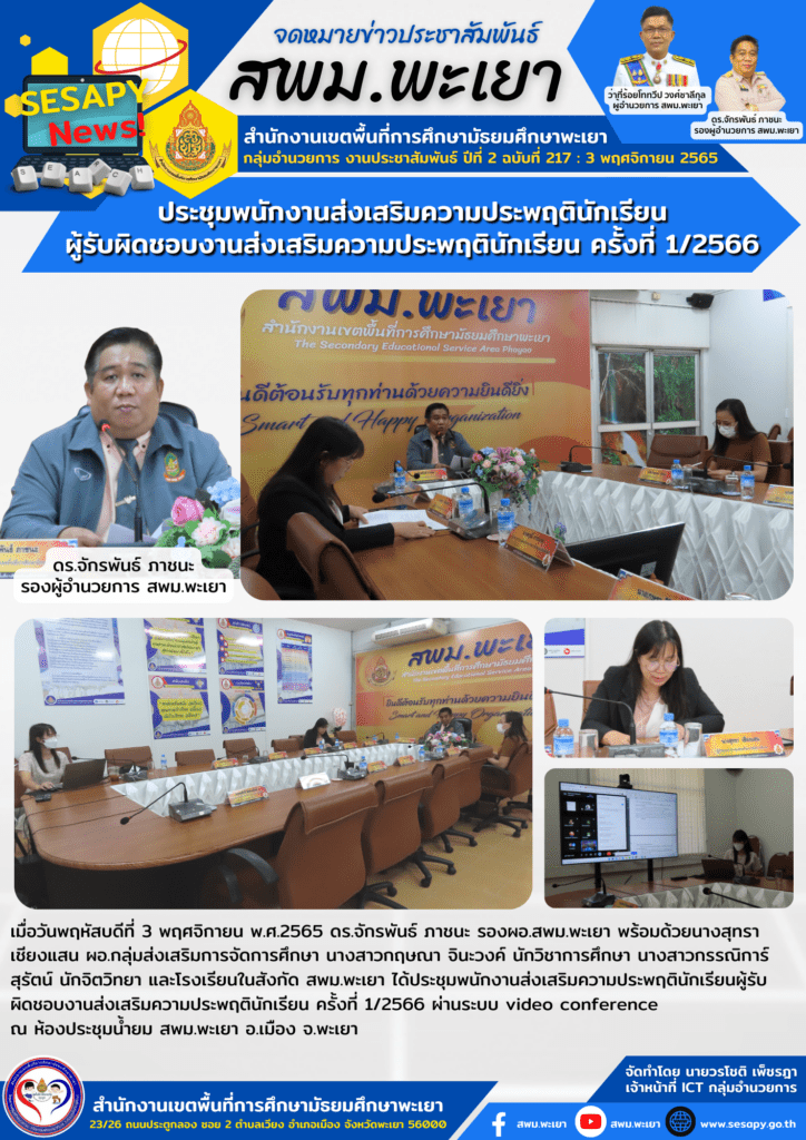 เมื่อวันพฤหัสบดีที่ 3 พฤศจิกายน พ.ศ.2565 ดร.จักรพันธ์ ภาชนะ รองผอ.สพม.พะเยา พร้อมด้วยนางสุทรา เชียงแสน ผอ.กลุ่มส่งเสริมการจัดการศึกษา นางสาวกฤษณา จินะวงค์ นักวิชาการศึกษา นางสาวกรรณิการ์ สุรัตน์ นักจิตวิทยา และโรงเรียนในสังกัด สพม.พะเยา ได้ประชุมพนักงานส่งเสริมความประพฤตินักเรียนผู้รับผิดชอบงานส่งเสริมความประพฤตินักเรียน ครั้งที่ 1/2566 ผ่านระบบ video conference ณ ห้องประชุมน้ำยม สพม.พะเยา อ.เมือง จ.พะเยา
