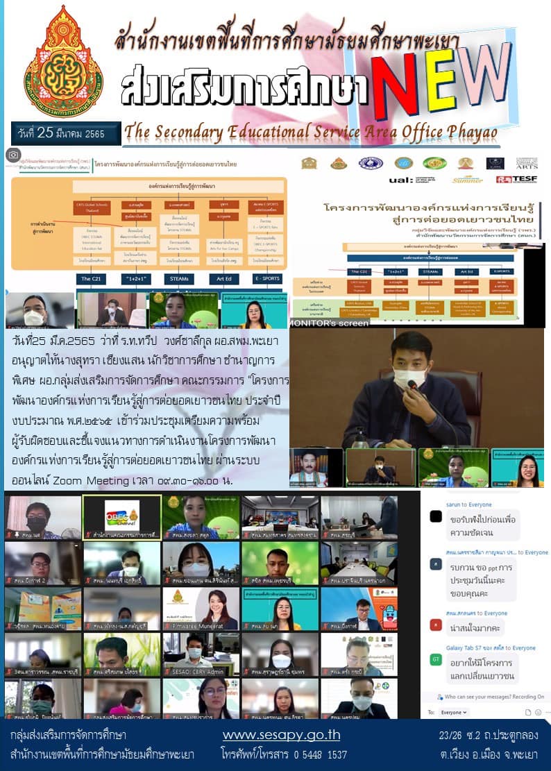 วันที่ 25 มี.ค.2565 ว่าที่ ร.ท.ทวีป วงศ์ซาลีกุล ผอ.สพม.พะเยา อนุญาตให้นางสุทรา เชียงแสน นักวิซาการศึกษา ชำนาญการ พิเศษ ผอ.กลุ่มส่งเสริมการจัดการศึกษา คณะกรรมการ “โครงการ พัฒนาองค์กรแ ห่งการเรียนรู้สู่การต่อยอดเยาวซนไทย ประจำปี งบประมาณ พ.ศ.2565 เข้าร่วมประชุมเตรียมความพร้อม ผู้รับผิดชอบและชี้แจงแนวทางการดำเนินงานโครงการพัฒนา องค์กรแ ห่งการเรียน รู้สู่การต่อยอดเยาวชนไทย ผ่านระบบ ออนไลน์ Zoom Meeting