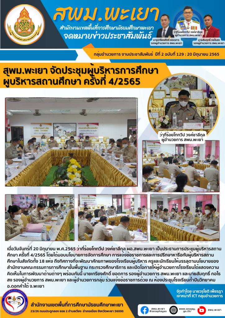 จดหมายข่าว สพม. สพม.พะเยา จัดประชุมผู้บริหารการศึกษา ผู้บริหารสถานศึกษา ครั้งที่ 4/2565 20 มิถุนายน 202221 มิถุนายน 2022