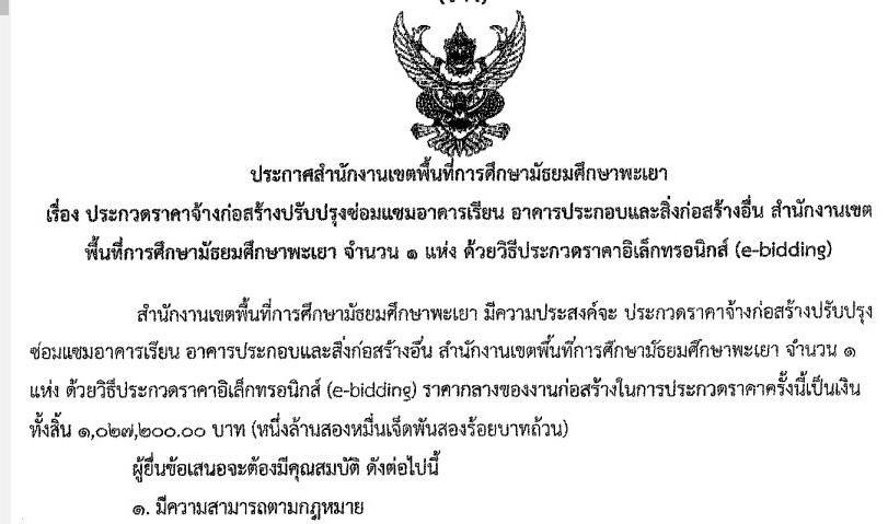 ประกาศจากกลุ่มบริหารงานการเงินและสินทรัพย์ ประกาศเผยแพร่ร่างประกาศประกวดราคา ร่างเอกสารประกวดราคาอิเล็กทรอนิกส์ (e-bidding) โครงการประกวดราคาจ้างก่อสร้างปรับปรุงซ่อมแซมอาคารเรียน อาคารประกอบและสิ่งก่อสร้างอื่น สำนักงานเขตพื้นที่การศึกษามัธยมศึกษาพะเยา จำนวน ๑ แห่ง เพื่อรับฟังคำวิจารณ์ 28 ธันวาคม 20227 มิถุนายน 2023
