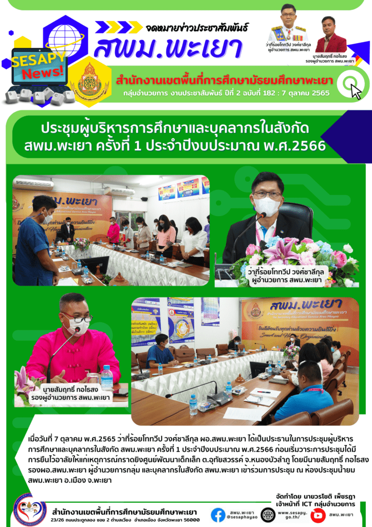 จดหมายข่าว สพม. ประชุมผู้บริหารการศึกษาและบุคลากรในสังกัด สพม.พะเยา ครั้งที่ 1 ประจำปีงบประมาณ พ.ศ.2566 7 ตุลาคม 2022