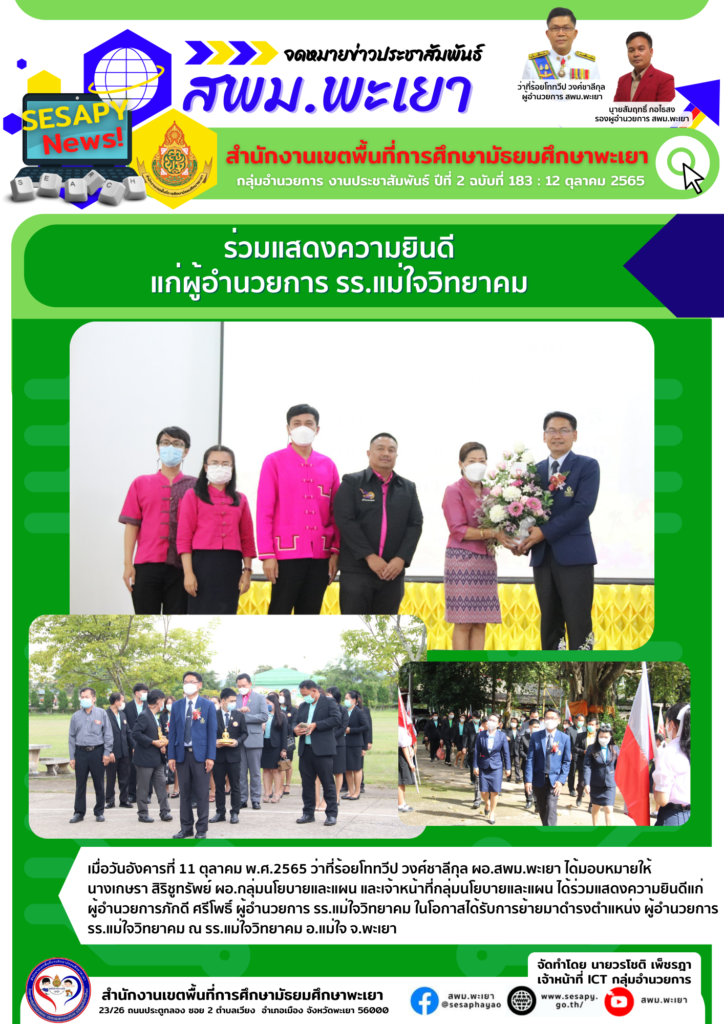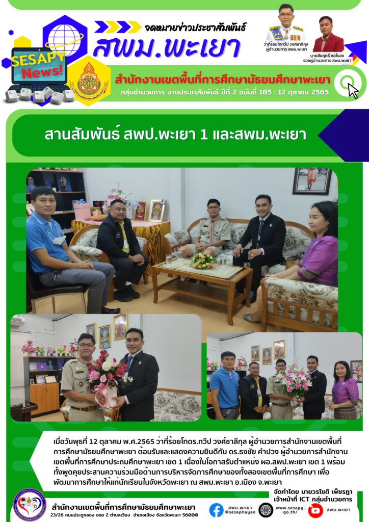 จดหมายข่าว สพม. ผอ.สพม.พะเยา ร่วมประชุมการลงพื้นที่ตรวจเยี่ยม และติดตามฯ ของรัฐมนตรีว่าการกระทรวงศึกษาธิการ 18 ตุลาคม 202218 ตุลาคม 2022