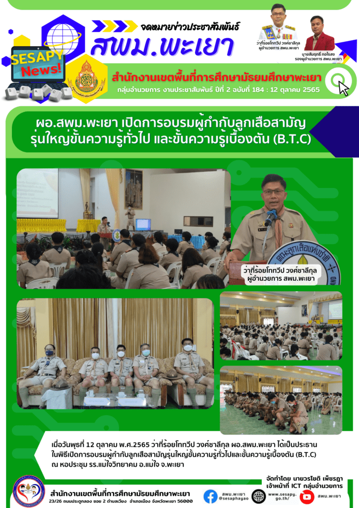 จดหมายข่าว สพม. ผอ.สพม.พะเยา เปิดการอบรมผู้กำกับลูกเสือสามัญ รุ่นใหญ่ขั้นความรู้ทั่วไป และขั้นความรู้เบื้องตัน (B.T.C) 13 ตุลาคม 202213 ตุลาคม 2022