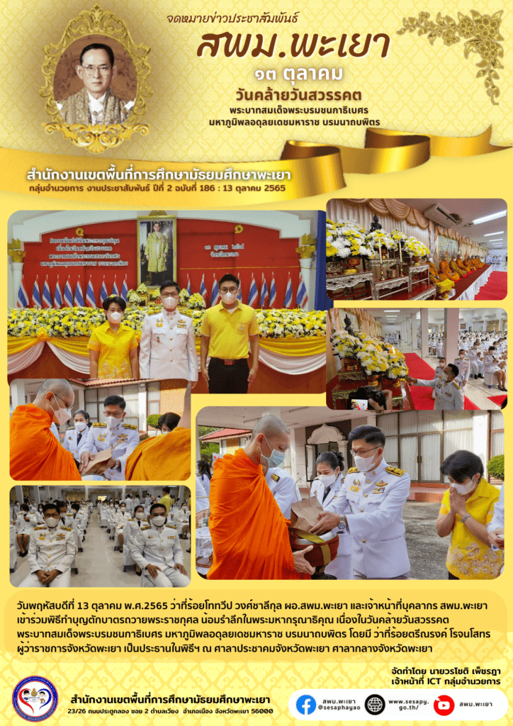 จดหมายข่าว สพม. พิธีทำบุญตักบาตรถวายพระราชกุศล น้อมรำลึกในพระมหากรุณาธิคุณ เนื่องในวันคล้ายวันสวรรคต พระบาทสมเด็จพระบรมชนกาธิเบศร มหาภูมิพลอดุลยเดชมหาราช บรมนาถบพิตร 13 ตุลาคม 202218 ตุลาคม 2022