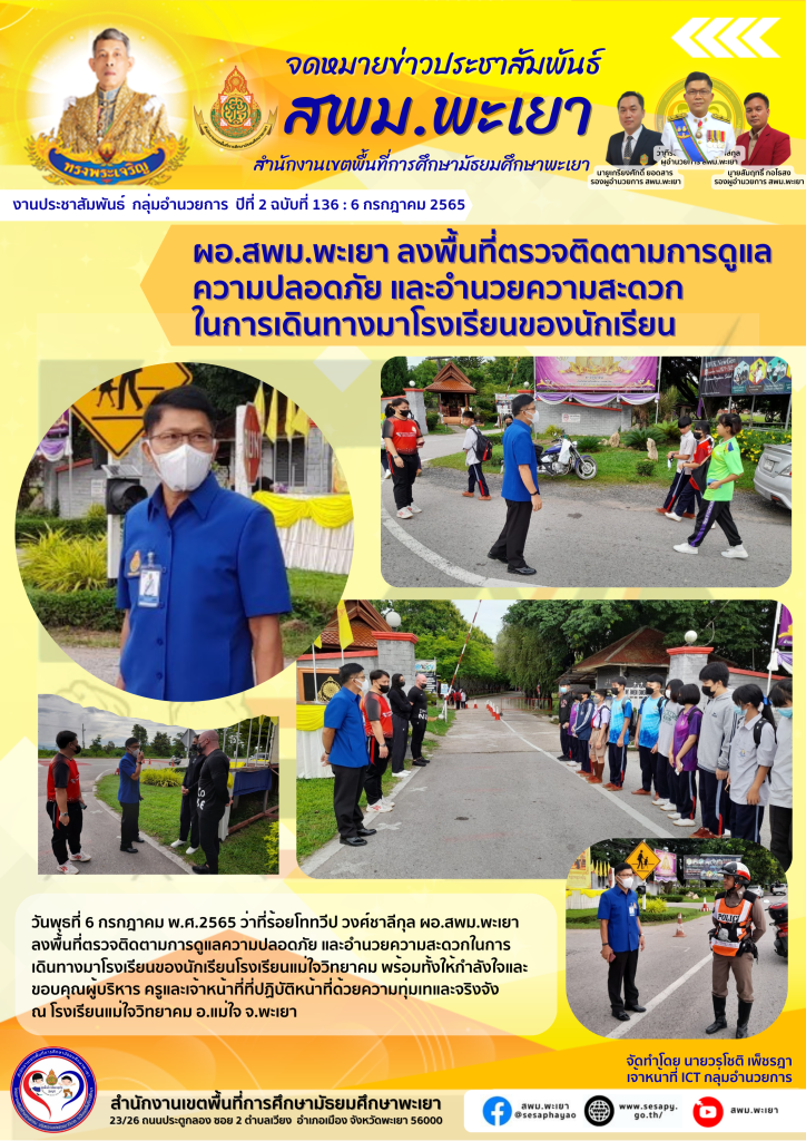 จดหมายข่าว สพม. ผอ.สพม.พะเยา ลงพื้นที่ตรวจติดตามการดูแลความปลอดภัย และอำนวยความสะดวกในการเดินทางมาโรงเรียนของนักเรียน 6 กรกฎาคม 2022