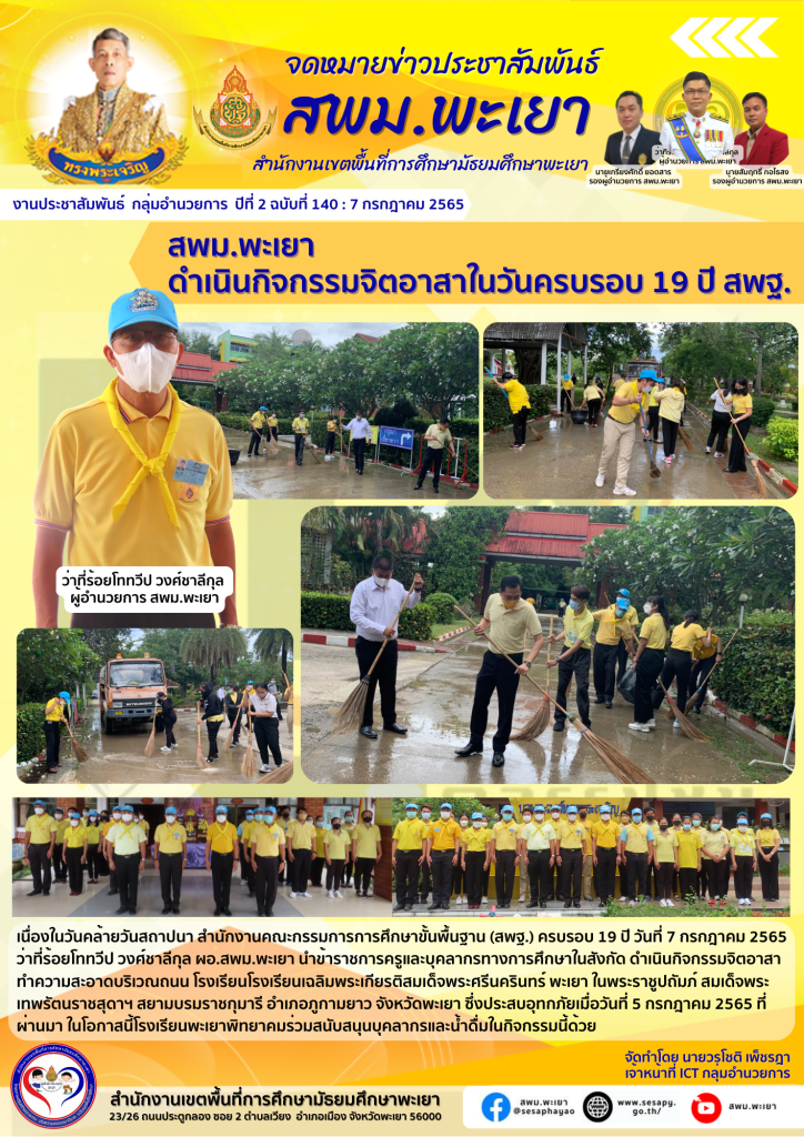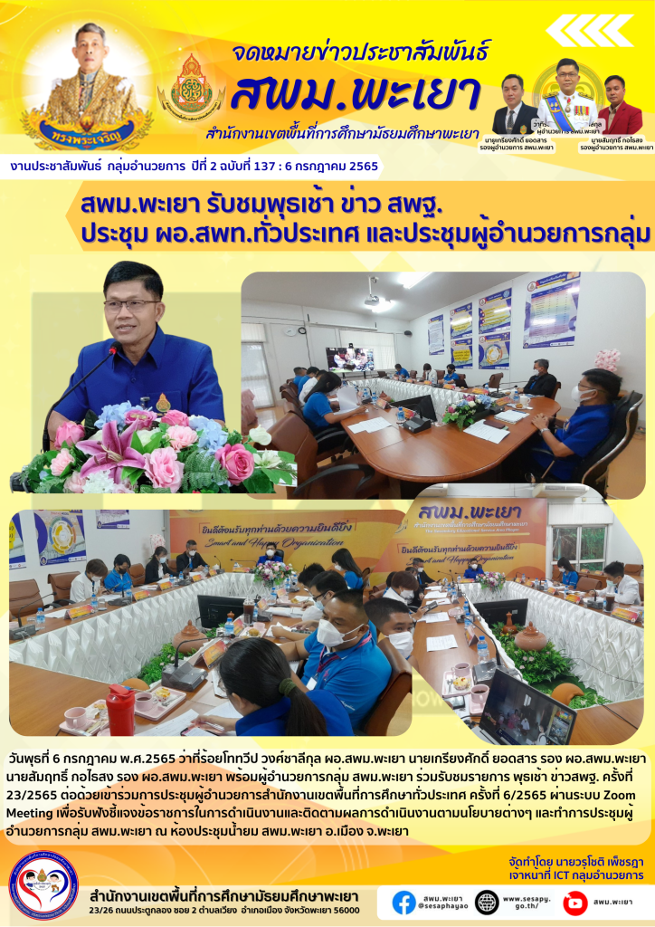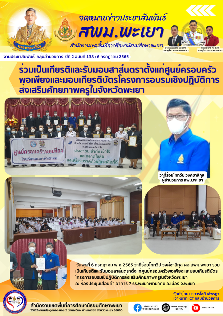 จดหมายข่าว สพม. ร่วมเป็นเกียรติและรับมอบสาส์นตราตั้งแก่ศูนย์ครอบครัวพอเพียงและมอบเกียรติบัตรโครงการอบรมเชิปฏิบัติการส่งเสริมศักยภาพครูในจังหวัดพะเยา 6 กรกฎาคม 2022