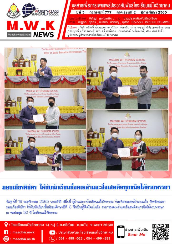 จดหมายข่าวโรงเรียน รร.แม่ใจวิทยาคม มอบเกียรติบัตรให้กับนักเรียนที่งดเหล้าและสิ่งเสพติดครบพรรษา ประจำปี2565 19 พฤศจิกายน 202219 พฤศจิกายน 2022
