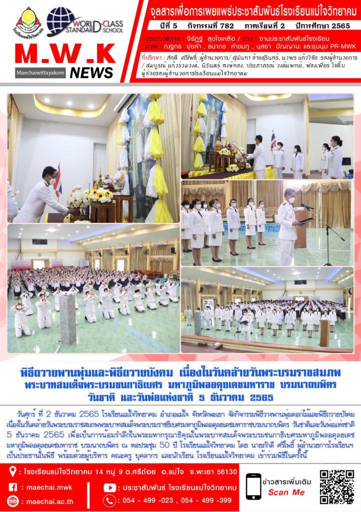 จดหมายข่าวโรงเรียน โรงเรียนแม่ใจวิทยาคม จัดกิจกรรมพิธีวางพานพุ่มดอกไม้และพิธีถวายบังคม เนื่องในวันคล้ายวันพระบรมราชสมภพพระบาทสมเด็จพระบรมราชธิเบศรมหาภูมิพลอดุลยเดชมหาราชบรมนาถบพิตร วันชาติและวันพ่อแห่งชาติ 5 ธันวาคม 2565 2 ธันวาคม 20222 ธันวาคม 2022
