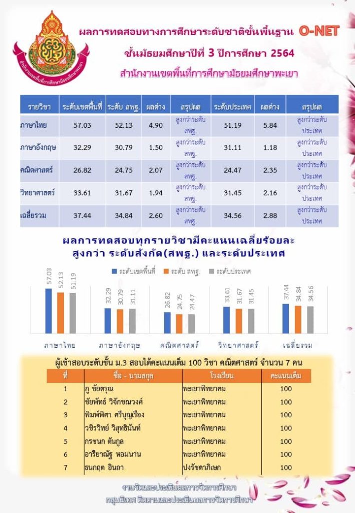 ข่าวกิจกรรม สพม.พะเยา ผลการทดสอบทางการศึกษาระดับชาติขั้นพื้นฐาน O-NET ชั้นมัธยมศึกษาปีที่ 3 ปีการศึกษา 2564 1 เมษายน 2022