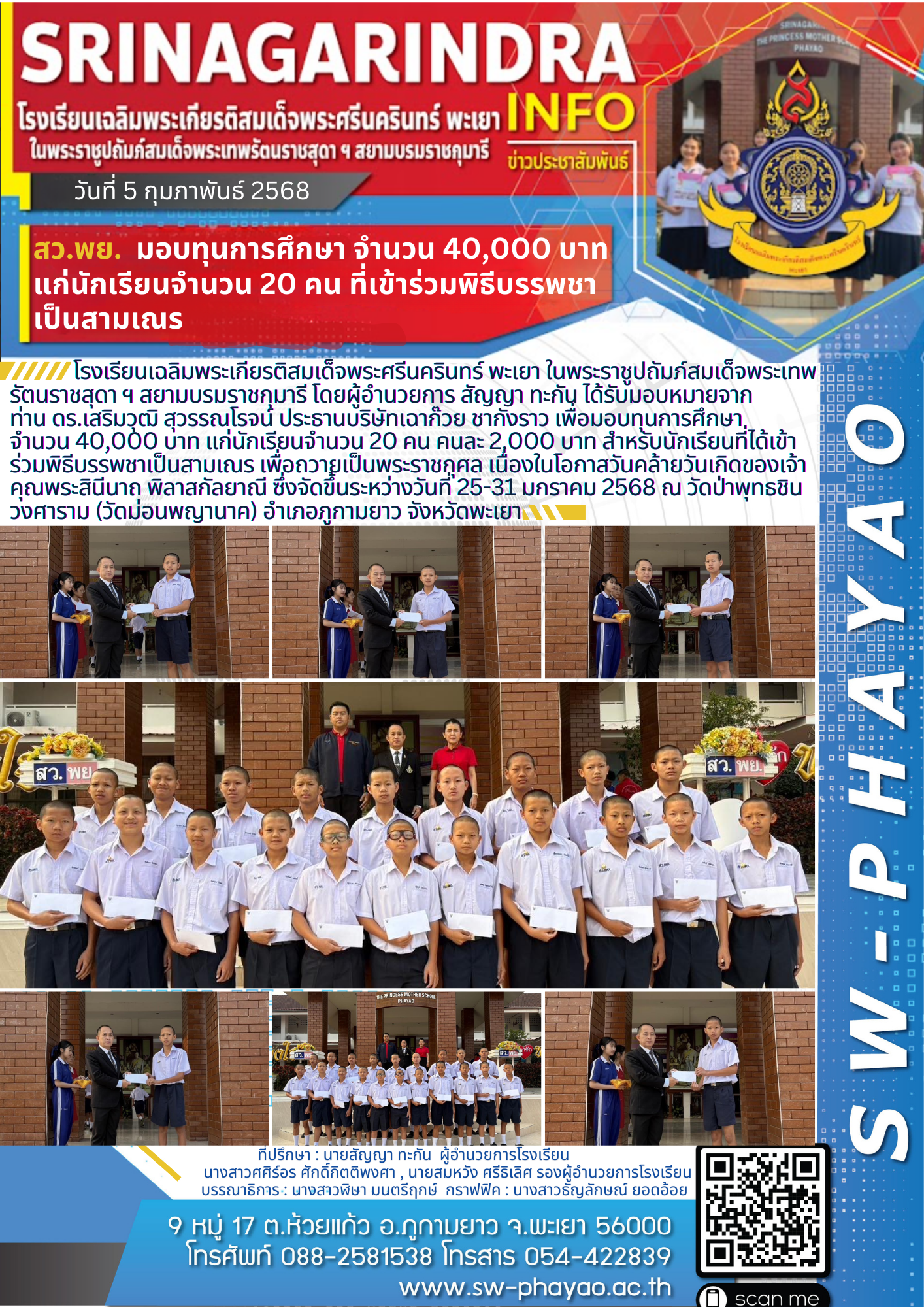 จดหมายข่าวโรงเรียน สว.พย. มอบทุนการศึกษา จำนวน 40,000 บาท แก่นักเรียนจำนวน 20 คน ที่เข้าร่วมพิธีบรรพชาเป็นสามเณร 5 กุมภาพันธ์ 20255 กุมภาพันธ์ 2025