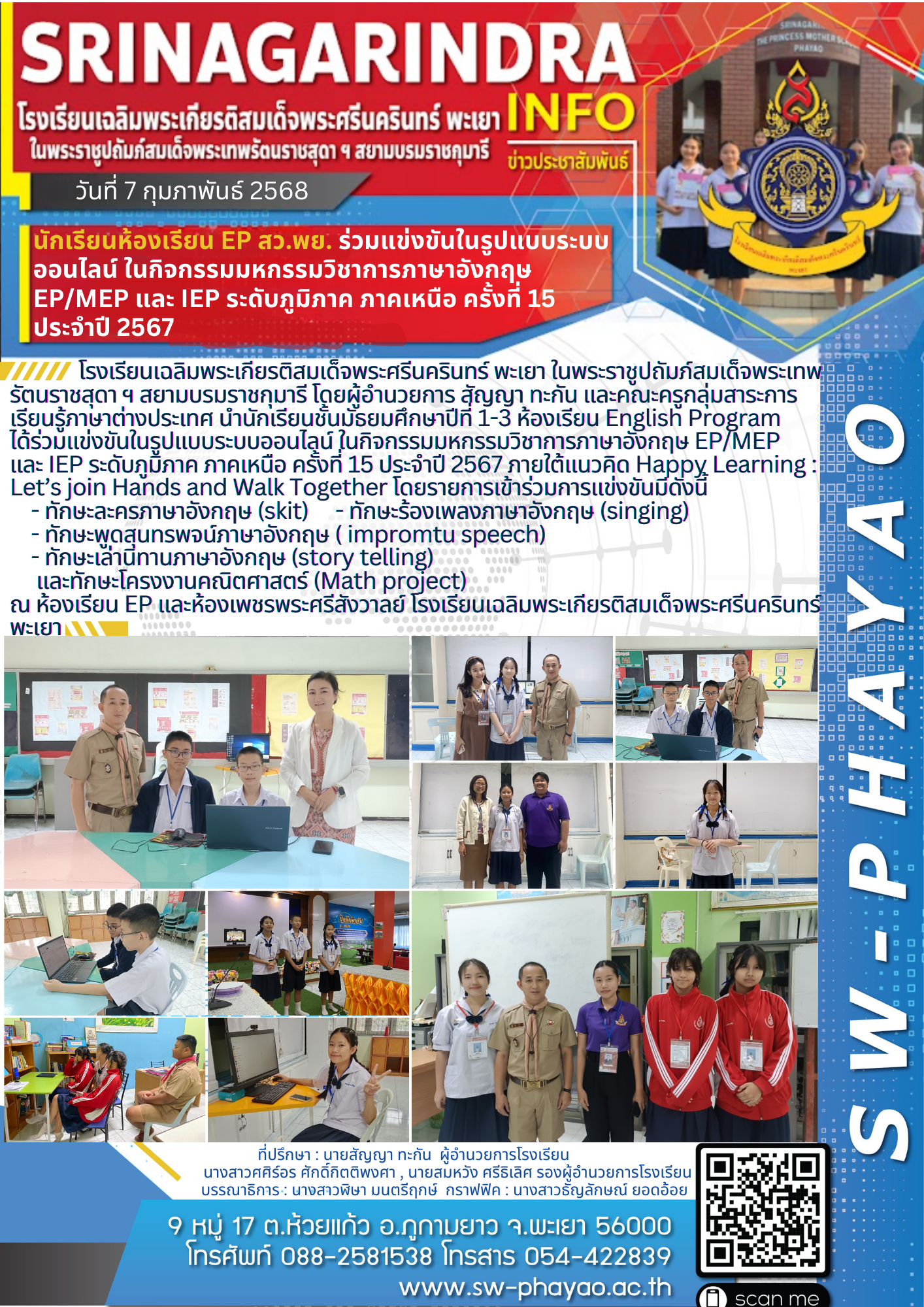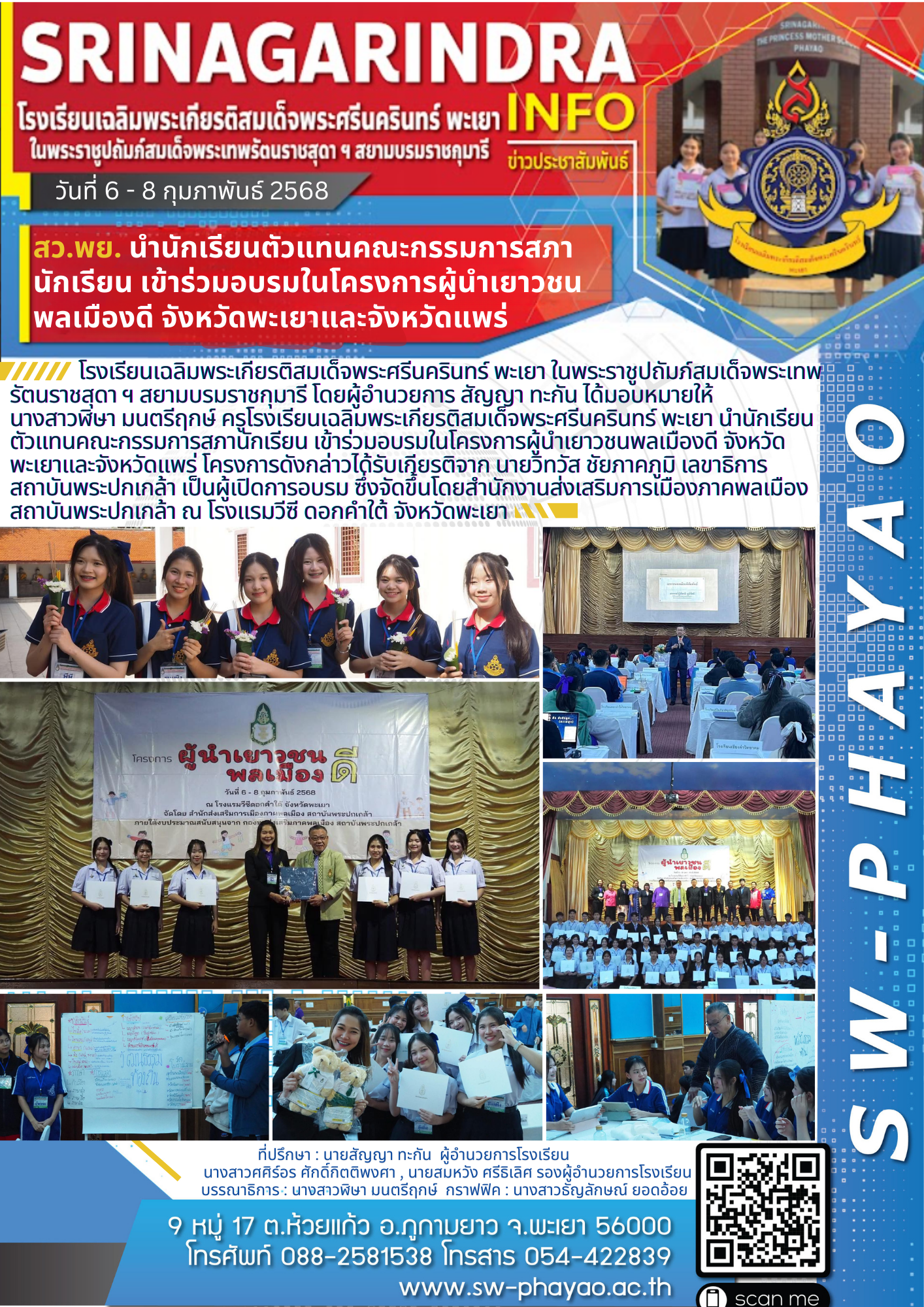 จดหมายข่าวโรงเรียน สว.พย. นำนักเรียนตัวแทนคณะกรรมการสภานักเรียน เข้าร่วมอบรมในโครงการผู้นำเยาวชนพลเมืองดี จังหวัดพะเยาและจังหวัดแพร่ 9 กุมภาพันธ์ 20259 กุมภาพันธ์ 2025
