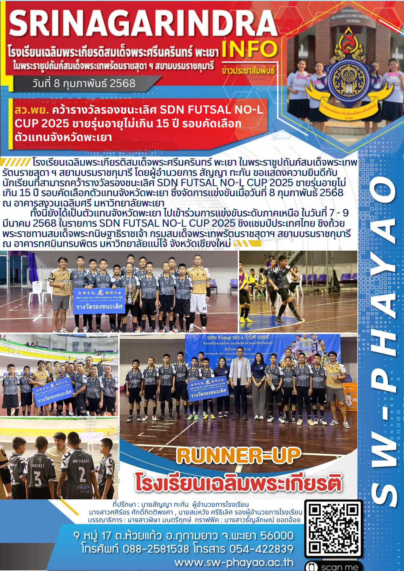 จดหมายข่าวโรงเรียน สว.พย. คว้ารางวัลรองชนะเลิศ SDN FUTSAL NO-L CUP 2025 ชายรุ่นอายุไม่เกิน 15 ปี รอบคัดเลือกตัวแทนจังหวัดพะเยา 10 กุมภาพันธ์ 202510 กุมภาพันธ์ 2025