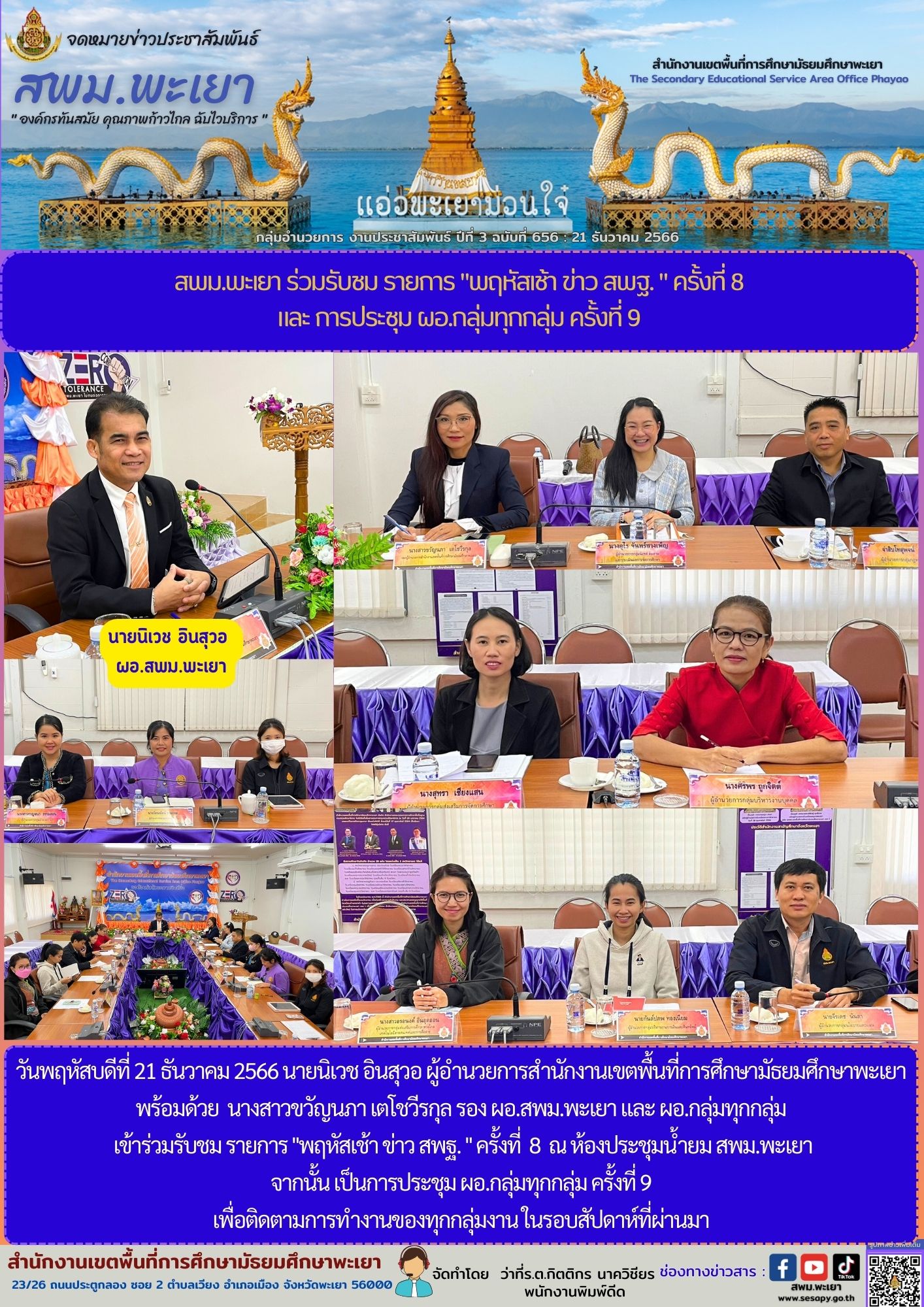 วันพฤหัสบดีที่ 21 ธันวาคม 2566 นายนิเวช อินสุวอ ผู้อำนวยการสำนักงานเขตพื้นที่การศึกษามัธยมศึกษาพะเยา พร้อมด้วย นางสาวขวัญนภา เตโชวีรกุล รอง ผอ.สพม.พะเยา และ ผอ.กลุ่มทุกกลุ่ม