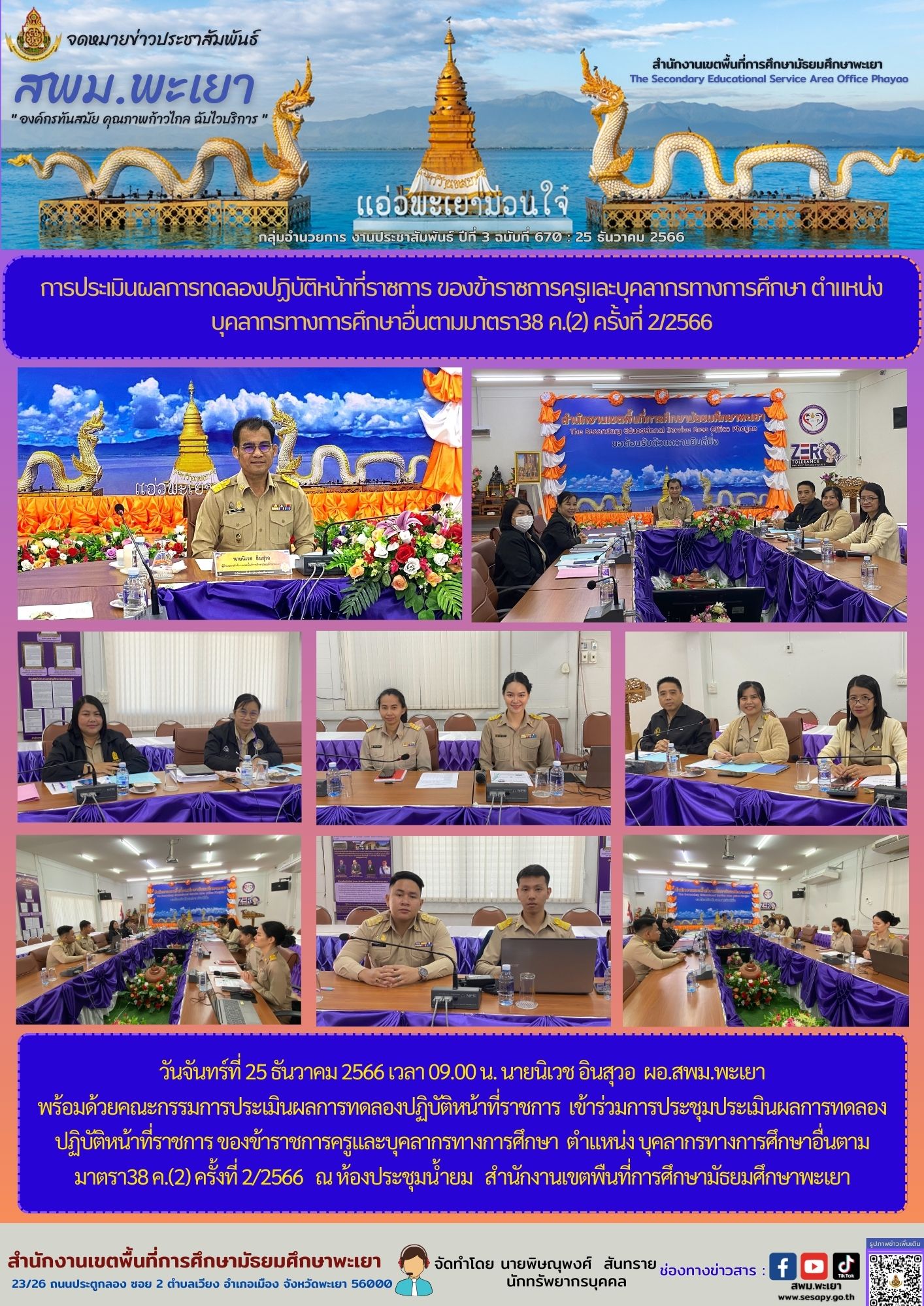 วันจันทร์ที่ 25 ธันวาคม 2566 เวลา 09.00 น. นายนิเวช อินสุวอ ผอ.สพม.พะเยา