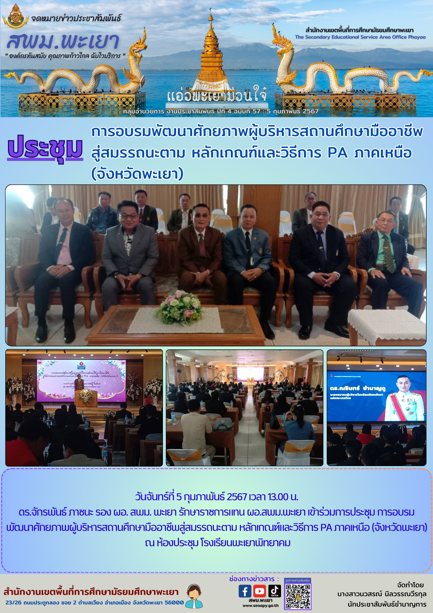 ประชุม การอบรมพัฒนาศักยภาพผู้บริหารสถานศึกษามืออาชีพสู่สมรรถนะตามหลักเกณฑ์และวิธีการ PA ภาคเหนือ (จังหวัดพะเยา)