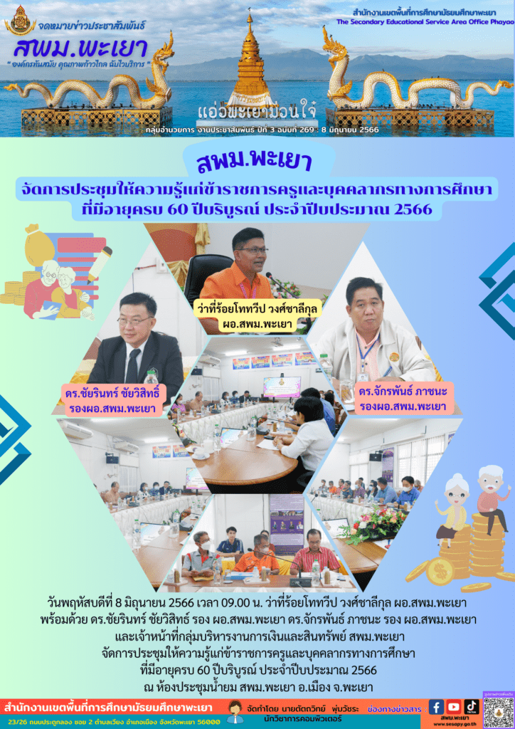 สพม.พะเยาจัดการประชุมให้ความรู้แก่ข้าราชการครูและบุคคลากรทางการศึกษาที่มีอายุครบ 60 ปีบริบูรณ์ ประจำปีบประมาณ 2566