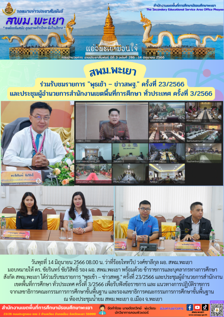 สังกัด สพม.พะเยา ได้ร่วมรับชมรายการ “พุธเช้า – ข่าวสพฐ.” ครั้งที่ 23/2566 และประชุมผู้อำนวยการสำนักงานเขตพื้นที่การศึกษา ทั่วประเทศ ครั้งที่ 3/2566 เพื่อรับฟังข้อราชการ และ แนวทางการปฏิบัติราชการ