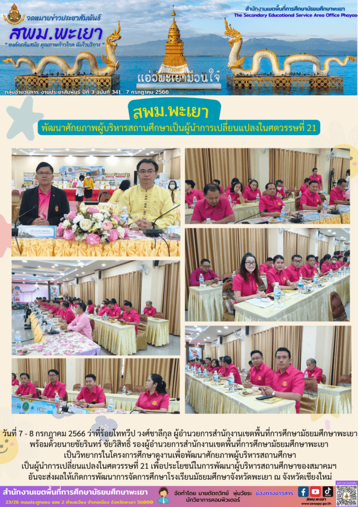 วันที่ 7 – 8 กรกฎาคม 2566 ว่าที่ร้อยโททวีป วงศ์ชาลีกุล ผู้อำนวยการสำนักงานเขตพื้นที่การศึกษามัธยมศึกษาพะเยา พร้อมด้วยนายชัยรินทร์ ชัยวิสิทธิ์ รองผู้อำนวยการสำนักงานเขตพื้นที่การศึกษามัธยมศึกษาพะเยา