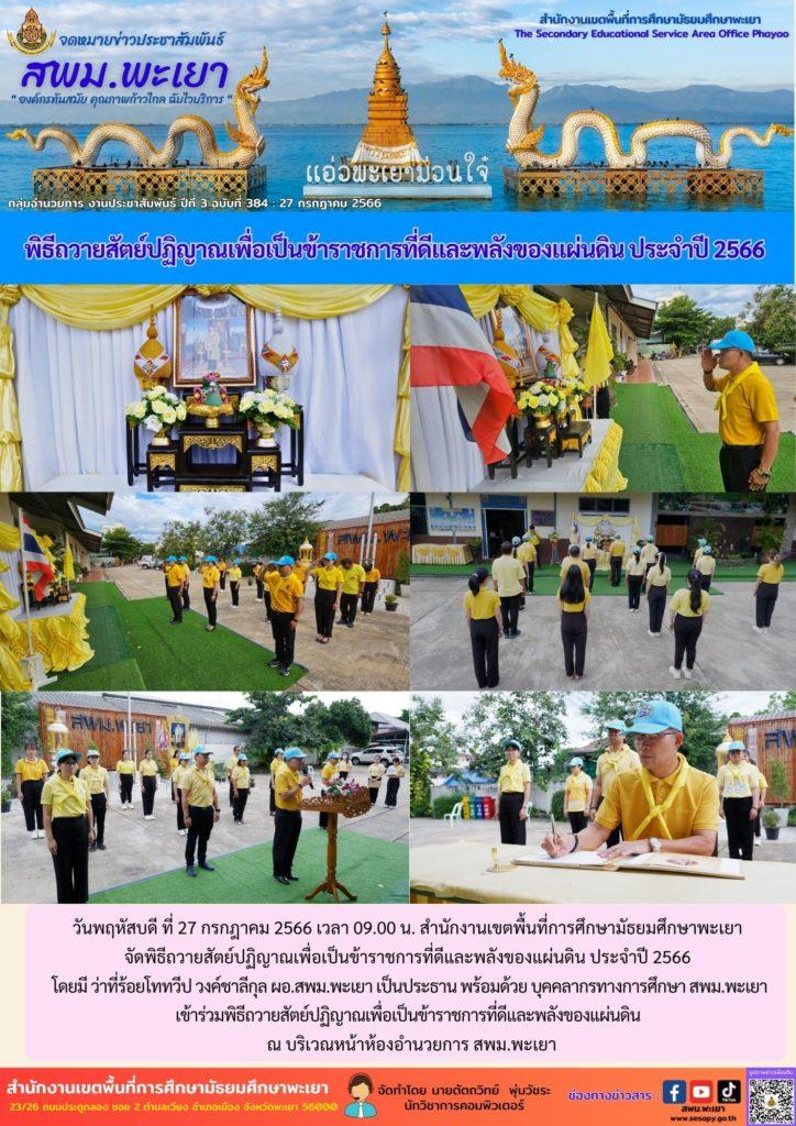 โดยมี ว่าที่ร้อยโททวีป วงค์ชาลีกุล ผอ.สพม.พะเยา เป็นประธาน พร้อมด้วย บุคคลากรทางการศึกษา สพม.พะเยา เข้าร่วมพิธีถวายสัตย์ปฏิญาณเพื่อเป็นข้าราชการที่ดีและพลังของแผ่นดิน
