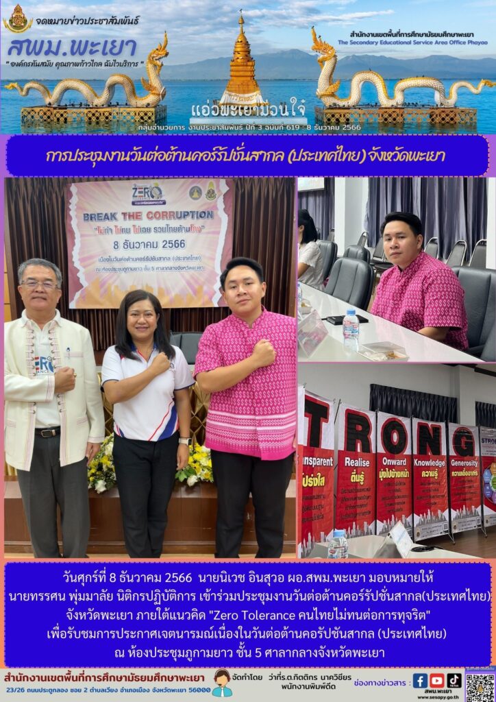 นายทรรศน พุ่มมาลัย นิติกรปฏิบัติการ เข้าร่วมประชุมงานวันต่อต้านคอร์รัปชั่นสากล(ประเทศไทย) จังหวัดพะเยา ภายใต้แนวคิด “Zero Tolerance คนไทยไม่ทนต่อการทุจริต”