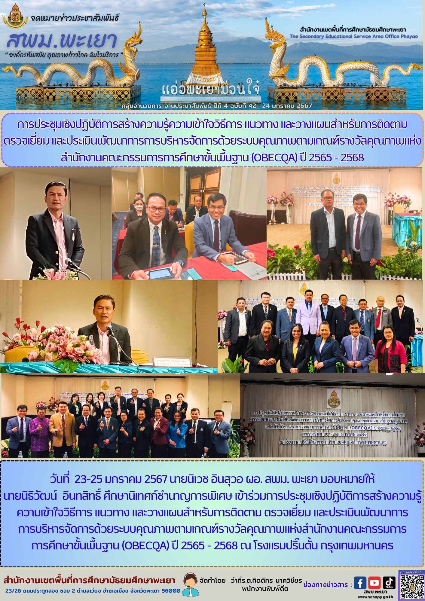 วันที่ 23-25 มกราคม 2567 นายนิเวช อินสุวอ ผอ. สพม. พะเยา มอบหมายให้