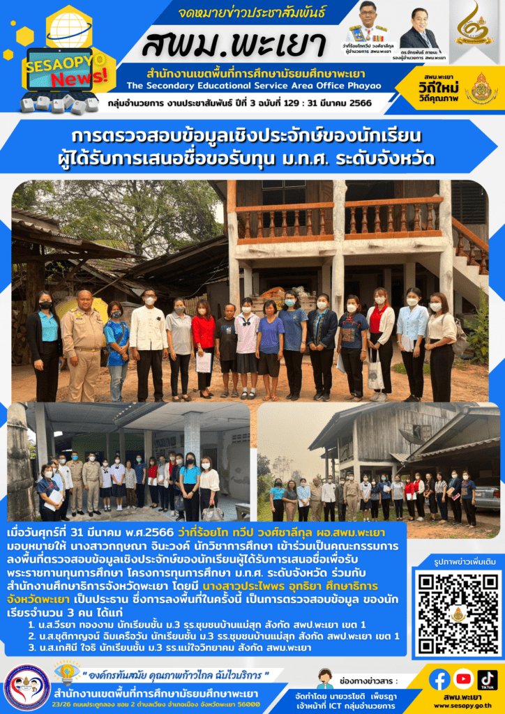 เมื่อวันศุกร์ที่ 31 มีนาคม พ.ศ.2566 ว่าที่ร้อยโท ทวีป วงศ์ชาลีกุล ผอ.สพม.พะเยา มอบหมายให้ นางสาวกฤษณา จินะวงค์ นักวิชาการศึกษา เข้าร่วมเป็นคณะกรรมการลงพื้นที่ตรวจสอบข้อมูลเชิงประจักษ์ของนักเรียนผู้ได้รับการเสนอชื่อเพื่อรับพระราชทานทุนการศึกษา โครงการทุนการศึกษา ม.ท.ศ. ระดับจังหวัด ร่วมกับสำนักงานศึกษาธิการจังหวัดพะเยา โดยมี นางสาวประไพพร อุทธิยา ศึกษาธิการจังหวัดพะเยา เป็นประธาน ซึ่งการลงพื้นที่ในครั้งนี้ เป็นการตรวจสอบข้อมูล ของนักเรียรจำนวน 3 คน ได้แก่