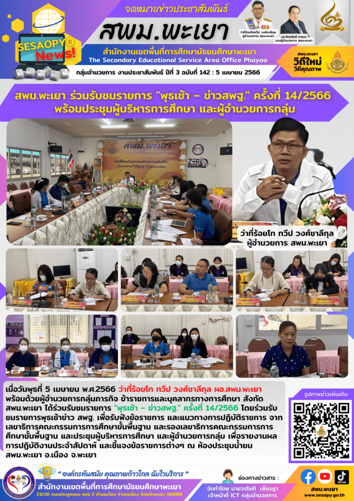 เมื่อวันพุธที่ 5 เมษายน พ.ศ.2566 ว่าที่ร้อยโท ทวีป วงศ์ชาลีกุล ผอ.สพม.พะเยา พร้อมด้วยผู้อำนวยการกลุ่มภารกิจ ข้าราชการและบุคลากรทางการศึกษา สังกัด สพม.พะเยา ได้ร่วมรับชมรายการ “พุธเช้า – ข่าวสพฐ.” ครั้งที่ 14/2566 โดยร่วมรับชมรายการพุธเช้าข่าว สพฐ. เพื่อรับฟังข้อราชการ และแนวทางการปฏิบัติราชการ จากเลขาธิการคณะกรรมการการศึกษาขั้นพื้นฐาน และรองเลขาธิการคณะกรรมการการศึกษาขั้นพื้นฐาน และประชุมผู้บริหารการศึกษา และผู้อำนวยการกลุ่ม เพื่อรายงานผลการปฏิบัติงานประจำสัปดาห์ และชี้แจงข้อราชการต่างๆ ณ ห้องประชุมน้ำยม สพม.พะเยา อ.เมือง จ.พะเยา