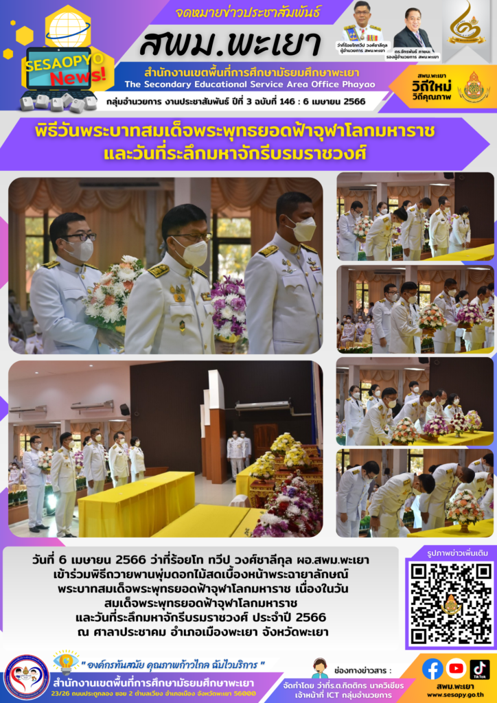 วันที่ 6 เมษายน 2566 ว่าที่ร้อยโท ทวีป วงศ์ชาลีกุล ผอ.สพม.พะเยา เข้าร่วมพิธีถวายพานพุ่มดอกไม้สดเบื้องหน้าพระฉายาลักษณ์ พระบาทสมเด็จพระพุทธยอดฟ้าจุฬาโลกมหาราช เนื่องในวันสมเด็จพระพุทธยอดฟ้าจุฬาโลกมหาราชและวันที่ระลึกมหาจักรีบรมราชวงศ์ ประจำปี 2566 ณ ศาลาประชาคม อำเภอเมืองพะเยา จังหวัดพะเยา